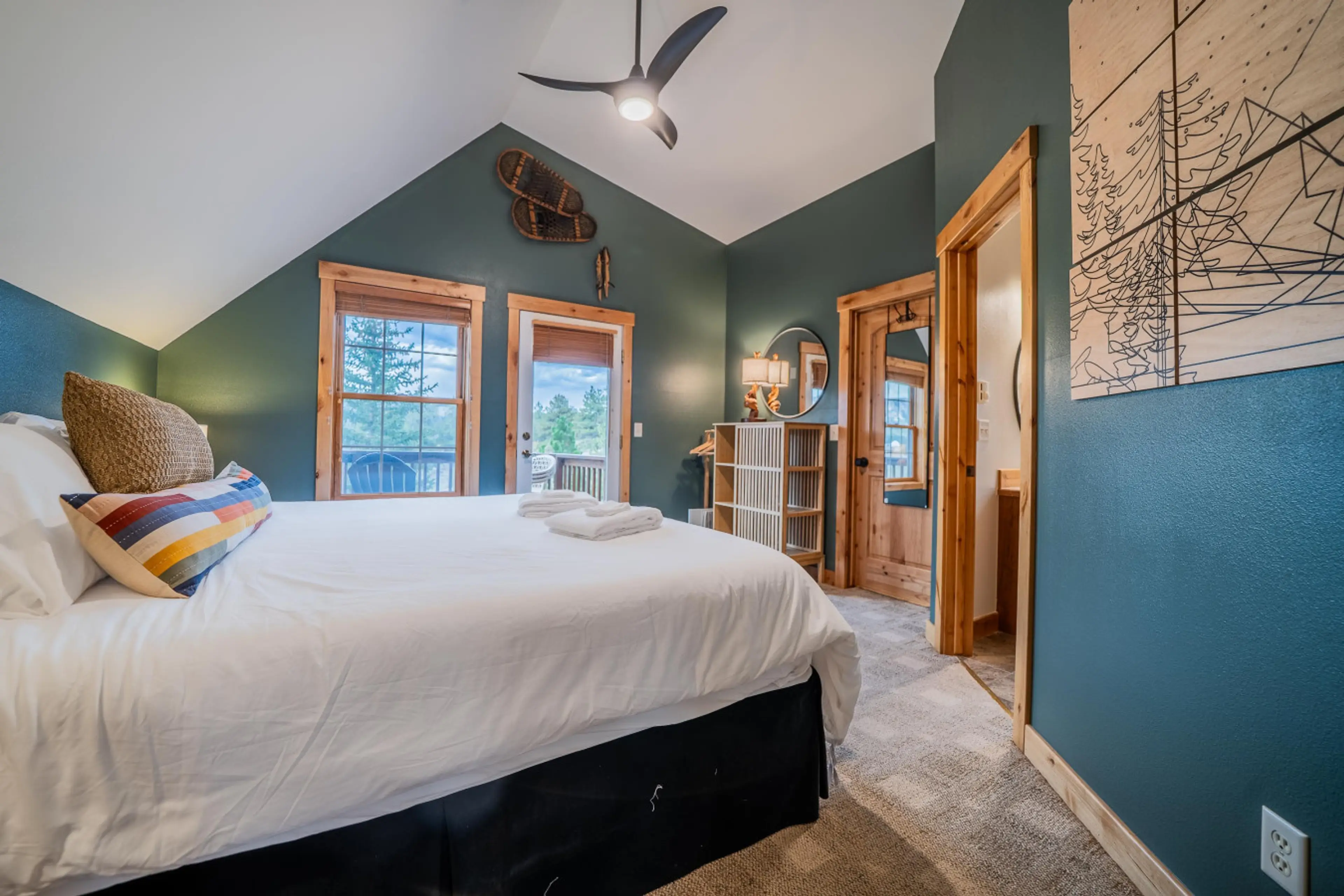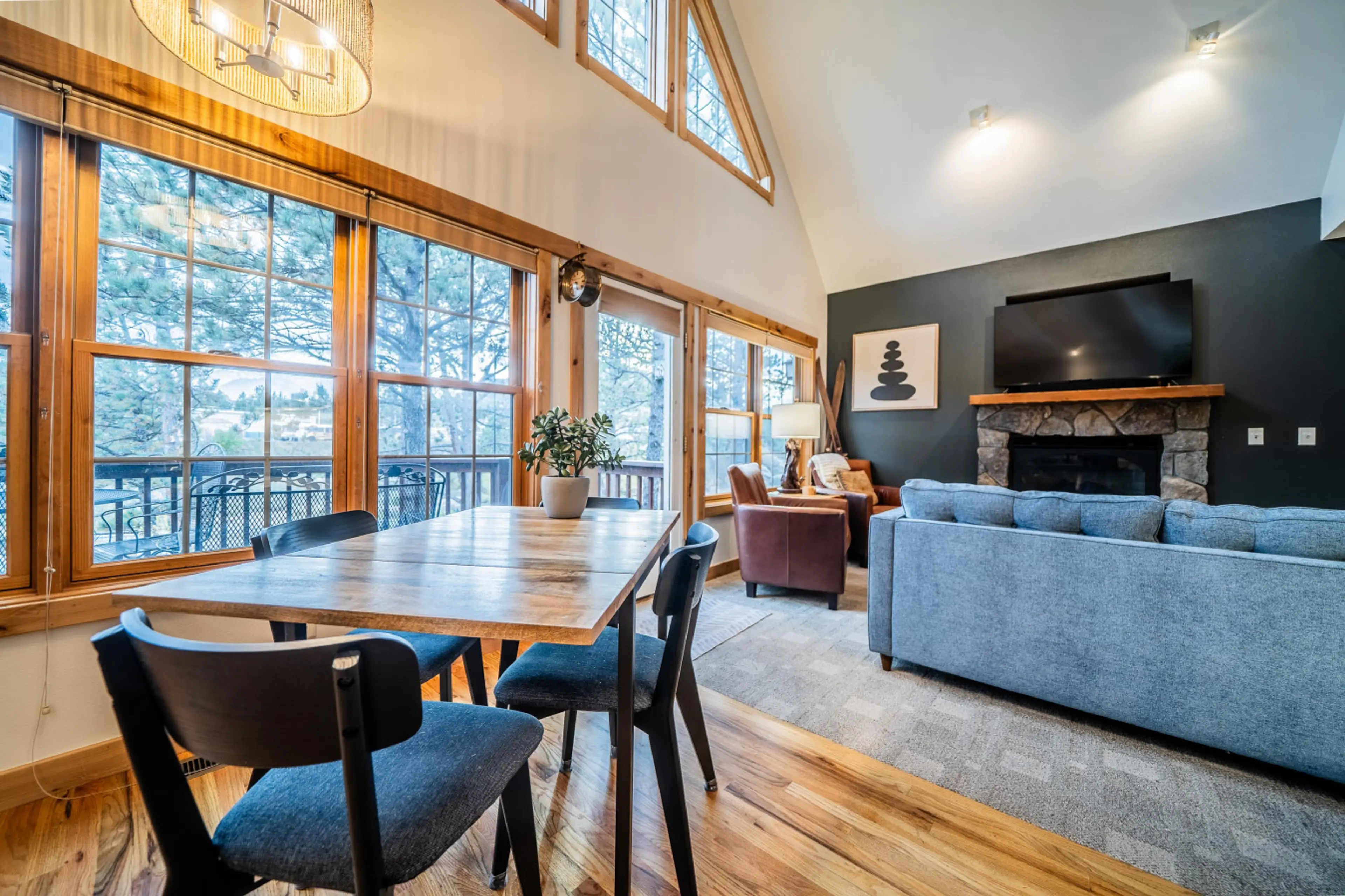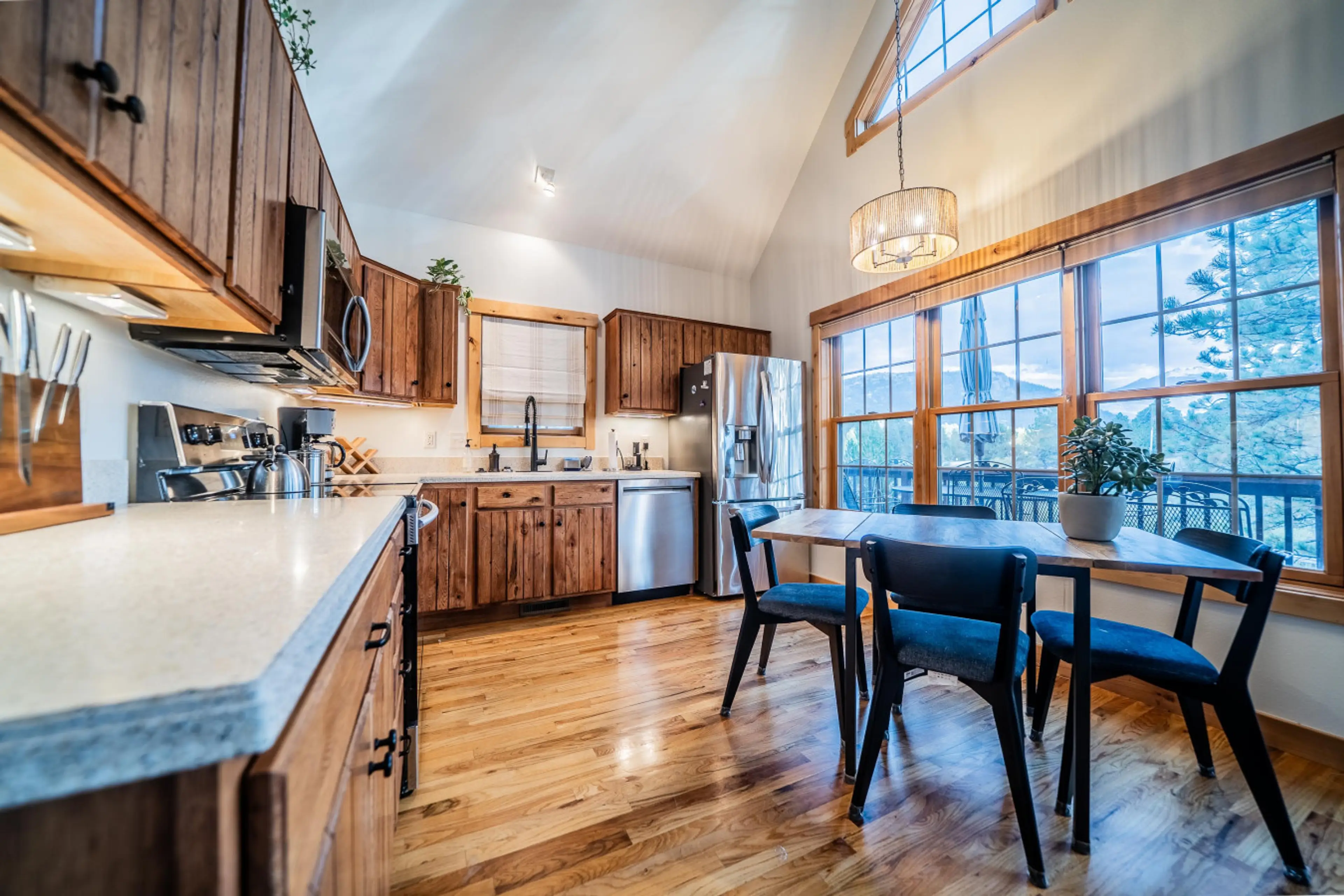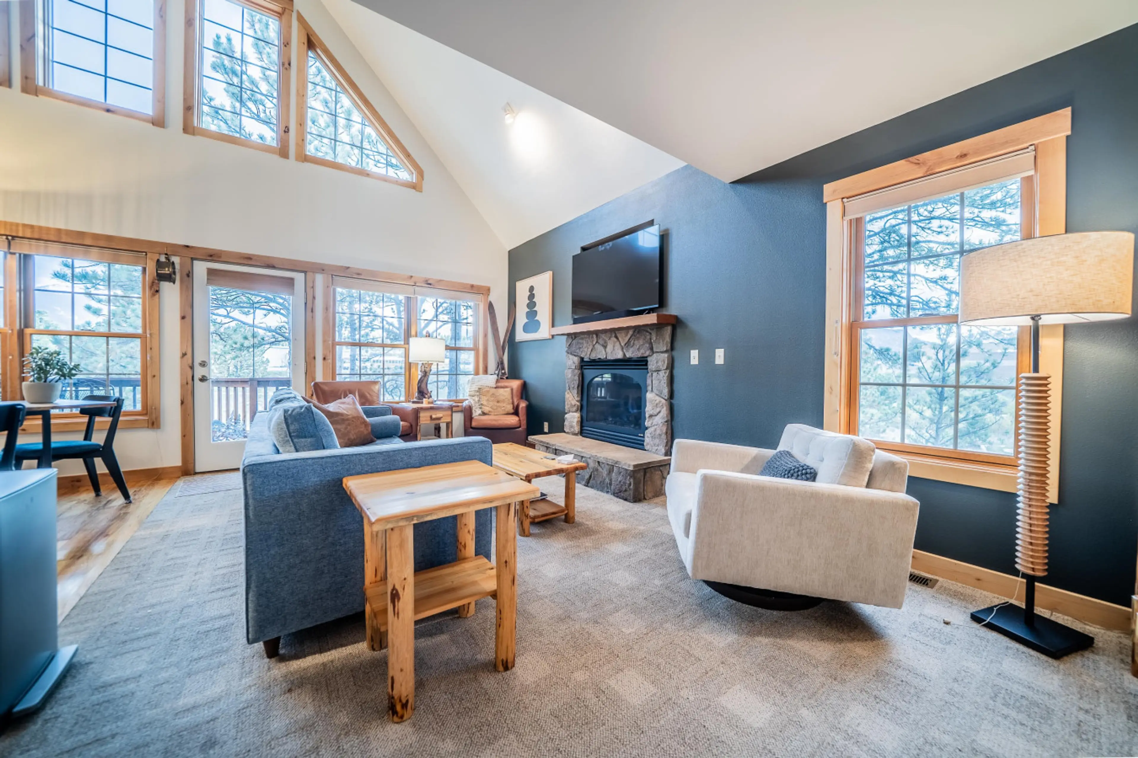 Raven 6 is an adventure-ready mountain home at Solitude Cabins with two decks & sunset dining views of Longs Peak, Meeker & Twin Sisters. Inside, relax w/ a gas fireplace and TV. Lake Estes views upstairs! - 4 min to downtown Estes Park; 10 min to Rocky Mountain National Park. - Two king suites (on...
