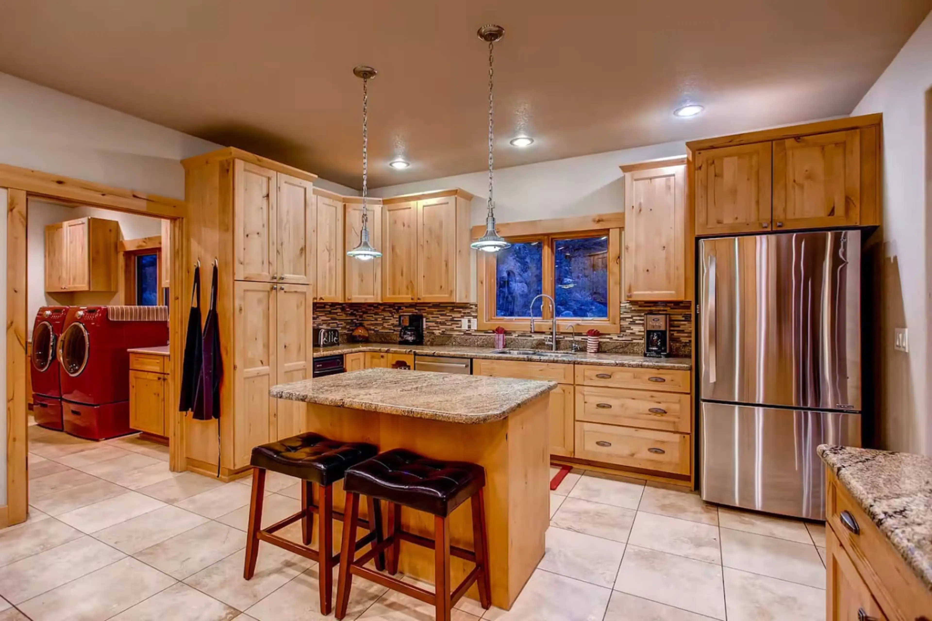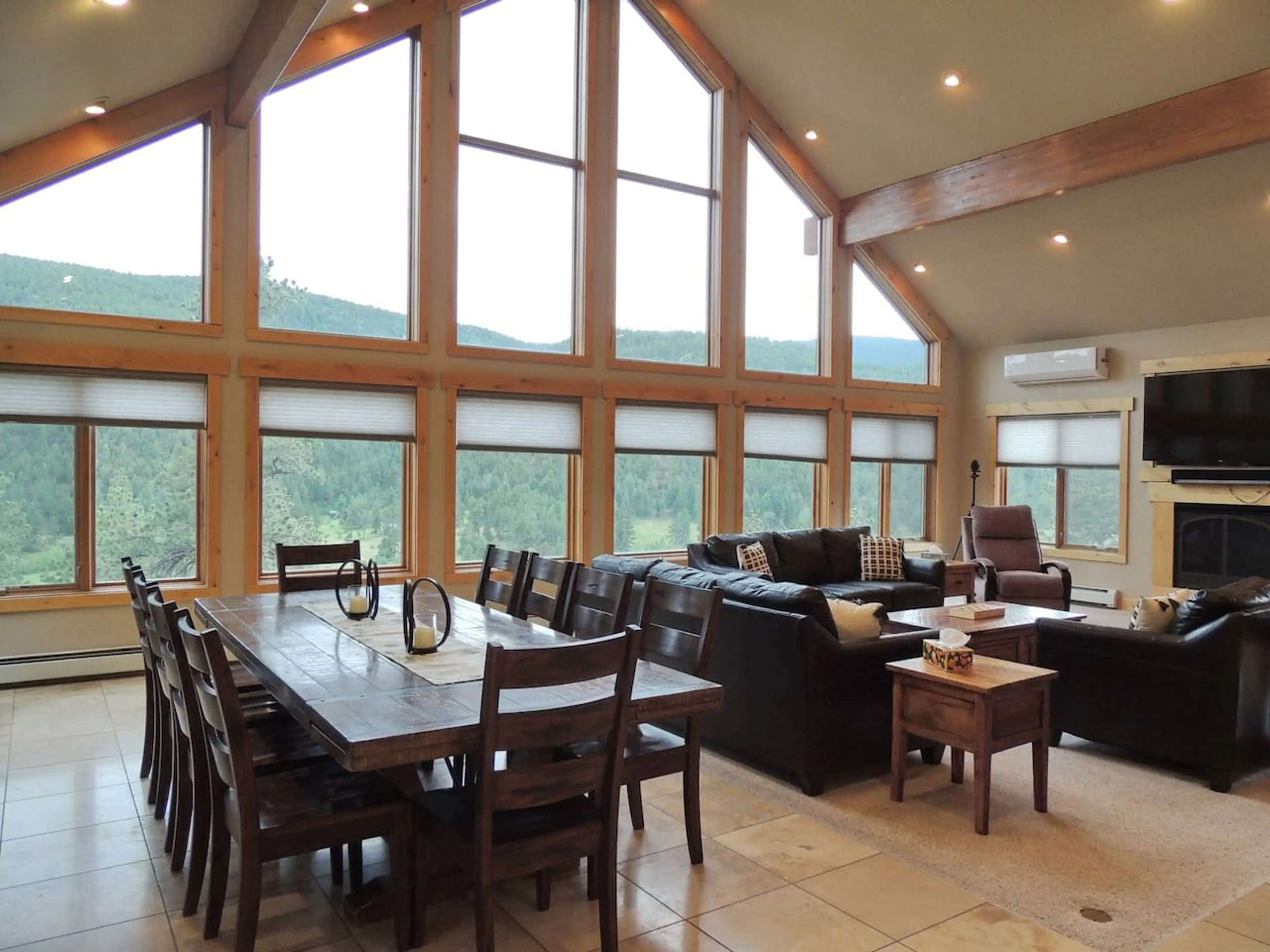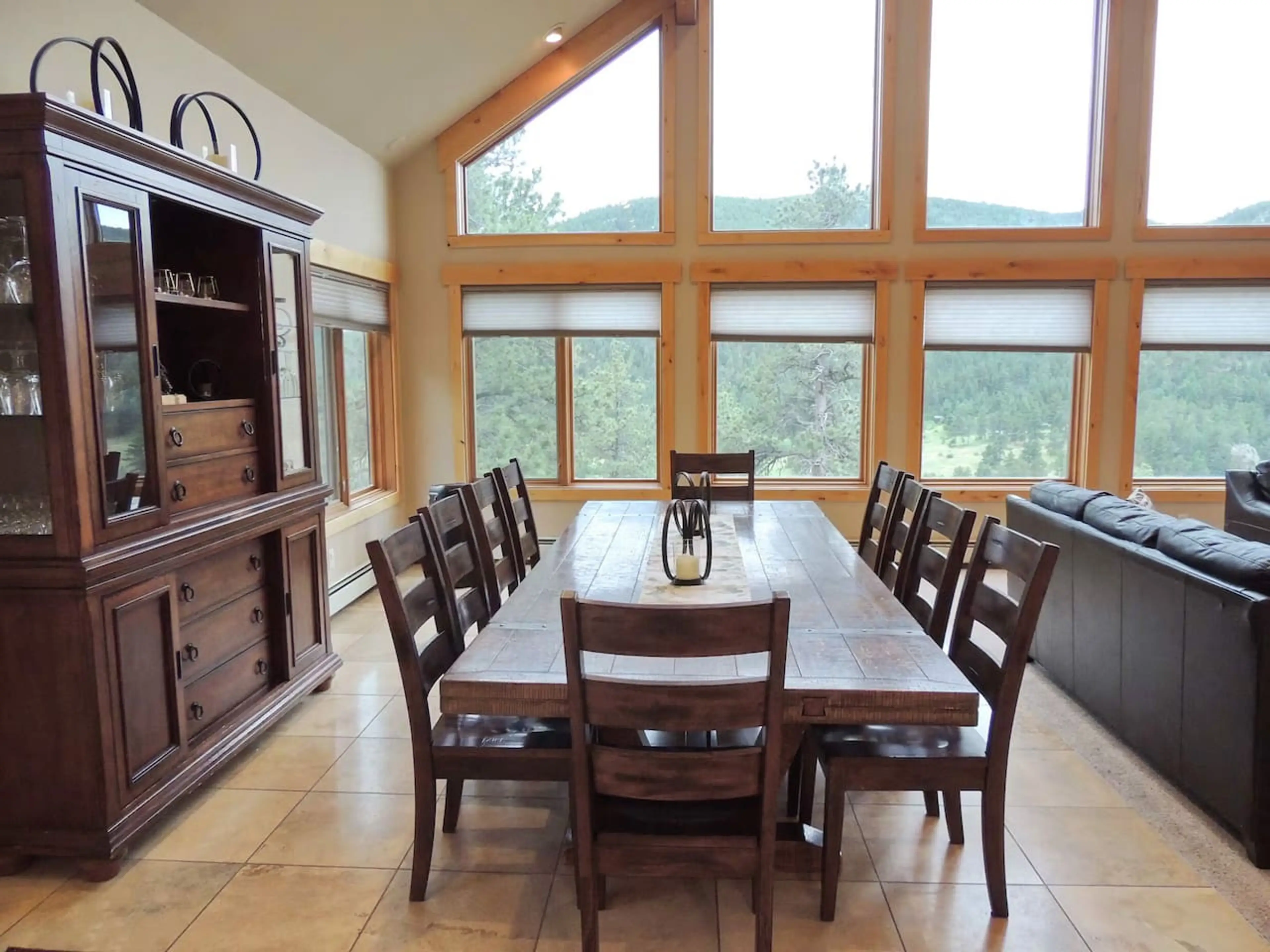Gather your group at this luxe mountain retreat near downtown Estes Park and Rocky Mountain National Park. Soak in the sun from a two-story window wall as you cook in a granite kitchen. Enjoy 18 private acres, with trails and a disc golf course. 5 bedrooms across 3 levels bordering Roosevelt Natio...